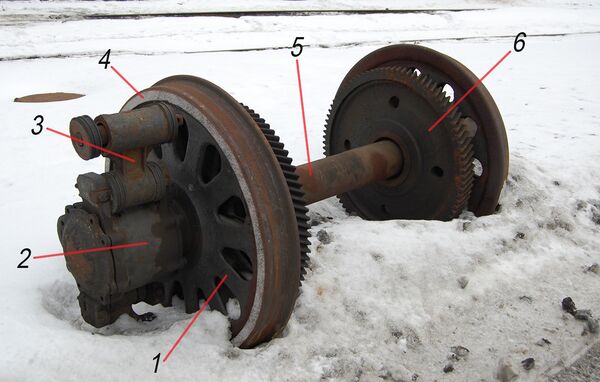 Различают ведущие и бегунковые колёсные пары. Ведущие по конструкции подобны локомотивным, бегунковые — вагонным. Отличаются от них размерами и конструкцией осевых редукторов.