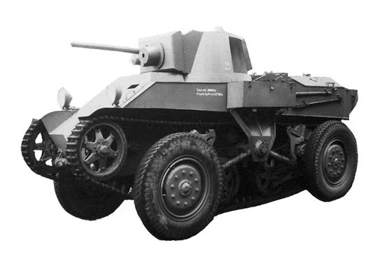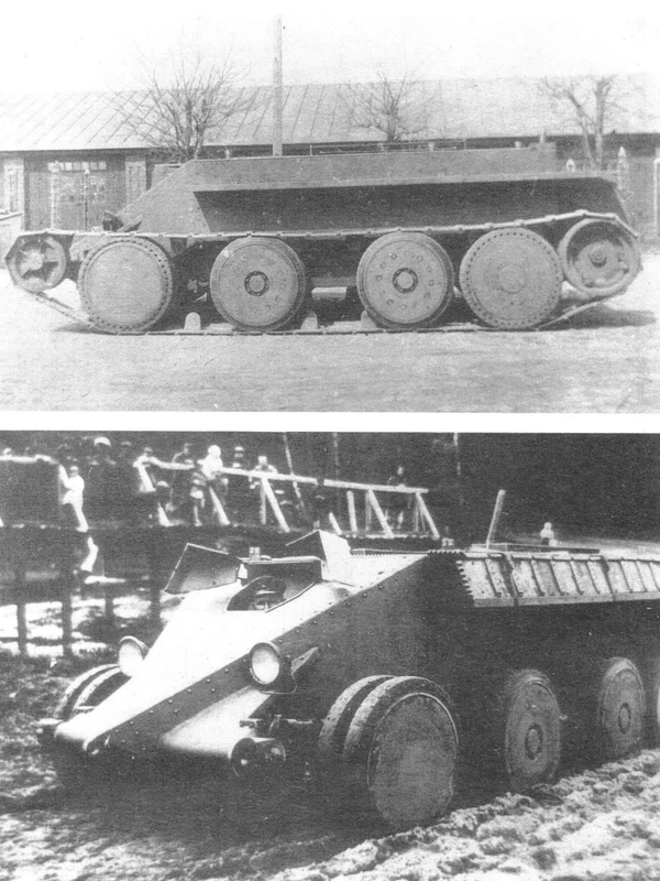 В 1926 году английские конструкторы предложили новое решение: на танке «Виккерс» поджимался не колёсный движитель, а гусеничный[2]. В следующем году был создан танк, у которого одновременно поднимался один движитель и опускался другой. Поляки в том же 1927 создали экспериментальный WB10. На гусеничном ходу 10ТР развивал 50-56 км/ч, а на колёсах 75 км/ч. Из 4 опорных колёс на борту первое было рулевым, а второе слегка убиралось вверх при движении без гусениц. При колёсном ходе трансмиссия переключалась на последние 2 колеса. Переход с колёс на гусеницы занимал 30-45 минут. В 1931 шведы выпустили танк La-30, у которого смена движителя происходила всего за 20 секунд, причём, операция могла проводиться прямо на ходу.