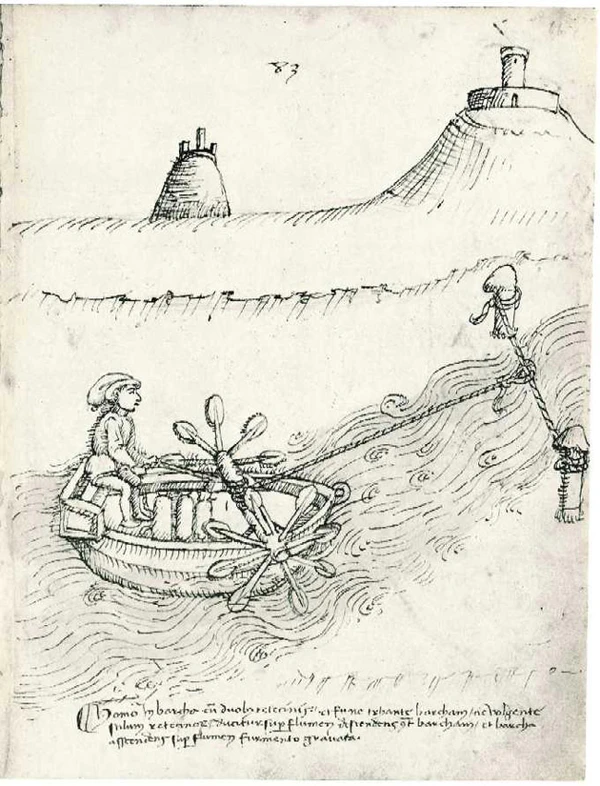 На одном из рисунков анонимного автора «Гуситских войн» изображена лодка с парой гребных колес на каждом конце, вращаемых людьми, управляющими составными кривошипами.[6] Эту концепцию усовершенствовал итальянец Роберто Валтурио в 1463 году, который разработал лодку с пятью наборами, где параллельные кривошипы соединены с одним источником питания одним шатуном, идея, принятая его соотечественником Франческо ди Джорджо.[6]