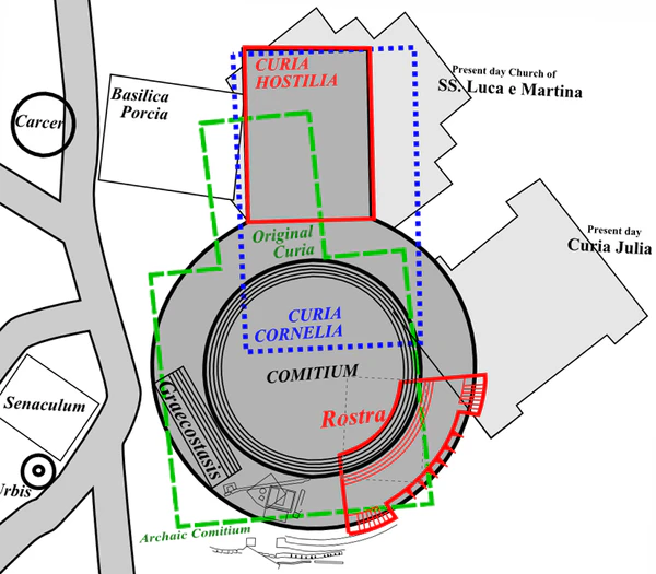 Комиций во времена римской республики был открытой площадкой рядом с курией (Курия Гостилия), позднее комиций приобрёл округлую форму, напоминающую амфитеатр. Это место было освящено авгурами. На краю комиция с конца VI века до н. э. в южной части располагались ростра (Rostra Vetera) — трибуна ораторов, и Graecostasis — трибуна, где могли выступить иностранные послы[1]. В западной части находилась мамертинская тюрьма и базилика Порция. На комиции располагались такие монументы как Ficus Navia, Puteal in Comitio, Statua Atti Navi, Statua Hermodori, Statua Horatii Cochlitis[2].