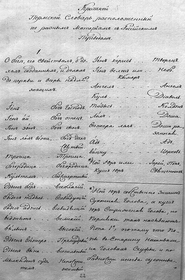 Отдельные заметки по коми-языкам сохранились ещё с XVIII века. Первые крупные исследование коми-пермяцкого (иньвенского диалекта) были проведены служащим Н. А. Роговым[31]: с 1851 по 1860 гг. он составлял грамматику языка, а с 1851 по 1869 гг. — собирал и описывал слова. Как отмечал сам Н. А. Рогов, основным источником для его работ была «живая речь народа, которую он старался изучать тщательно». Эти работы очень важны для науки, они дают подробную картину того, каким был коми-пермяцкий в XIX веке, и позволяют отследить развитие языка до наших дней.