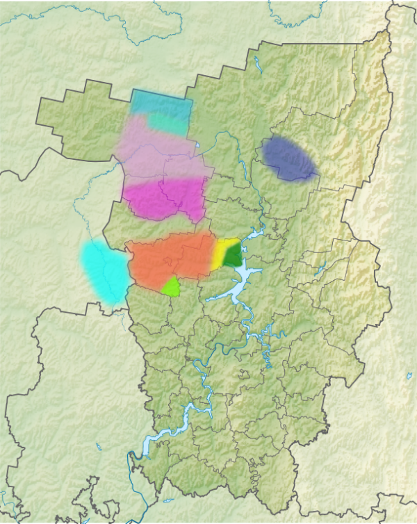 Диалекты коми-пермяцкого языка главным образом распространены на северо-западе Пермского края. Голубым цветом отмечен афанасьевский диалект, его ареал расположен на востоке Кировской области. Отдельно от остальных также находится коми-язьвинский диалект, он распространён на западе Красновишерского района.