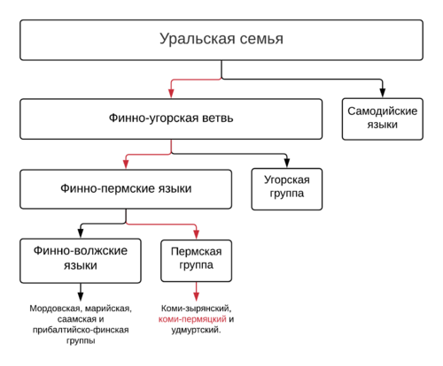 Невозможно точно определить, в какое время и в каком порядке языки-предки групп (прамордовский, прамарийский и др.) отделились от прауральского языка. Даниэл Абондоло в главе «Introduction» в книге «The Uralic Languages» излагает одну из современных гипотез. Он предполагает, что прапермский язык отделился от финно-угорского единства в последнюю очередь, завершив тем самым разделение финно-пермских и угорских языков, поэтому пермские языки наиболее близки к угорской группе. Наличие заимствований, схожие суффиксы инфинитива (перм. ny и венг. ni) и наименования десятков (коми -ymyn и венг. -vän) свидетельствуют о ранних контактах прапермского и древневенгерского языков. По данным некоторых учёных (напр. Décsy 1965: 154, 169, 172, 183), прапермский язык стал самостоятельным почти в то же время, что и венгерский. В терминологии Д. Абондоло пермские и угорские языки вместе составляют центральную ветвь уральской семьи, в то время как самодийская группа является восточной ветвью, в состав западной ветви входят марийские, мордовские и финно-саамские языки (в отечественной терминологии прибалтийско-финские и саамские).