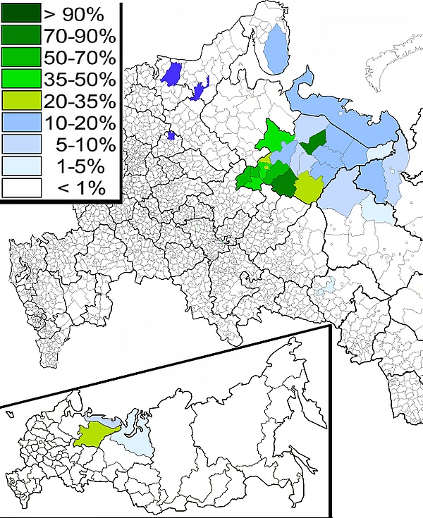 Указаны муниципальные образования, где доля коми в численности населения превышает 5 %: