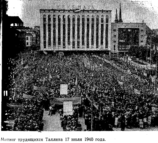 На состоявшихся 14 июля выборах в Рийгикогу победу одержал блок «Союз трудового народа Эстонии» (СТН) — единственная допущенная к участию в выборах политическая организация. Этот «Союз» включал в себя коммунистов и левых социалистов. В выборах приняло участие 591 030 граждан, или 84,1 % от общего числа избирателей. За кандидатов «Союза трудового народа» проголосовало 548 631 человек, или 92,8 % от числа голосовавших. Избирательные платформы СТН не содержали положений о провозглашении советской власти и вступлении в состав Советского Союза. Однако избранный парламент включил соответствующие положения в свои декларации. 21 июля 1940 года сессия вновь избранного парламента приняла решение об установлении в стране Советской власти и образовании Эстонской ССР, а 22 июля — «Декларацию о вхождении Эстонской ССР в состав Союза Советских Социалистических Республик». 23 июля были приняты декларации «Об объявлении земли всенародным достоянием» и «О национализации банков и крупной промышленности». На сессии Верховного Совета СССР, состоявшейся в начале августа, были «удовлетворены просьбы» новых парламентов Прибалтийских республик о включении последних в состав СССР[23].