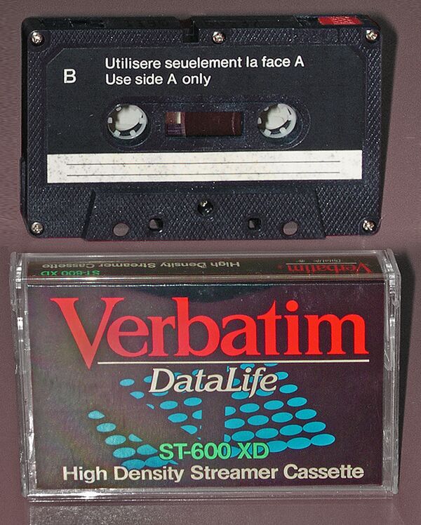 Использование более продвинутых методик модуляции в сочетании с улучшенными полосой пропускания и отношением сигнал/шум в новых лентах позволили значительно увеличить полезный объём (до 60 мегабайт) и скорость записи стандартной кассеты (до 10—17 кбит/с), что привело к появлению специализированного формата стримерных кассет (D/CAS). Этот формат использовался только для записи данных и применялся преимущественно для резервного копирования. Подобные кассеты были односторонними, так как для записи использовалась вся ширина ленты, поэтому контрольная выемка, защищающая кассету от перезаписи, была всего одна или её не было вовсе. Стримерные кассеты могли содержать в себе от 250 килобайт до 600 мегабайт данных[56]. Позднее этот формат эволюционирует в отдельный стандарт стримерных устройств и носителей к ним.