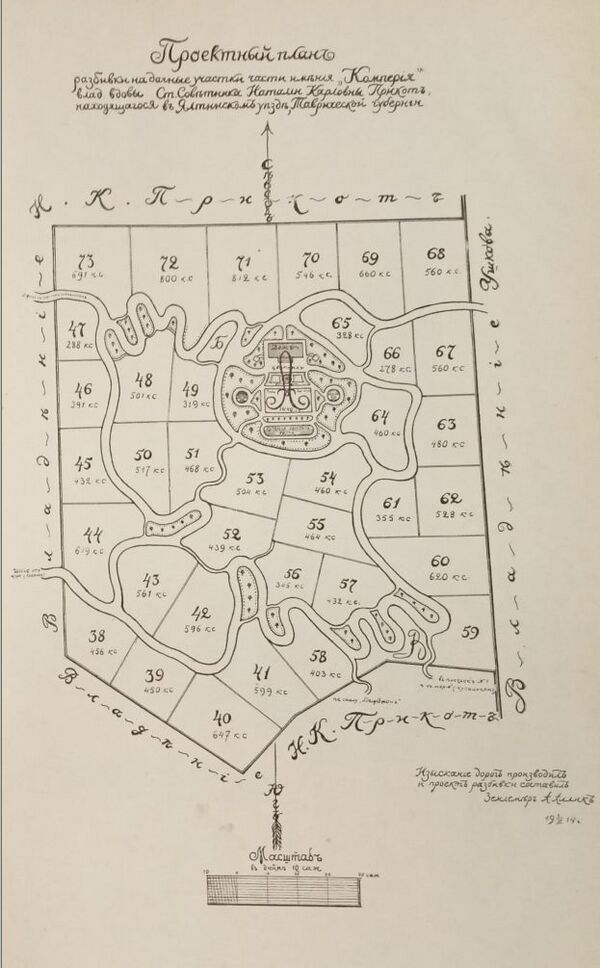 …разделённое на 3 части, принадлежащие г-жам Прикот, кн. Шаховской и Двигубской. Каждый участок составляет" около 100 дес. У г-жи Прикот есть маленький виноградник и дом, у прочих владелец построек нет[4]