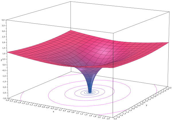 На рисунке показано, что вещественная часть как функция компонентов центрально-симметрична и зависит только от расстояния до начала координат. Она получается вращением графика вещественного логарифма вокруг вертикальной оси. С приближением к нулю функция стремится к