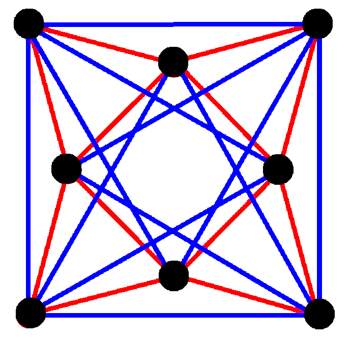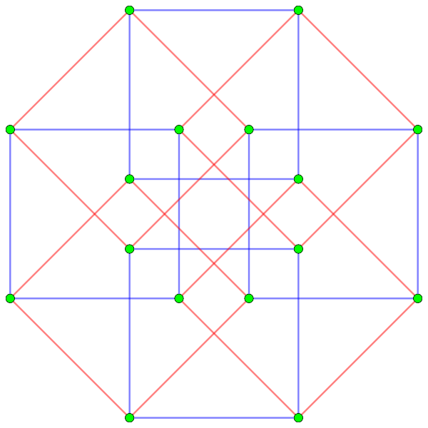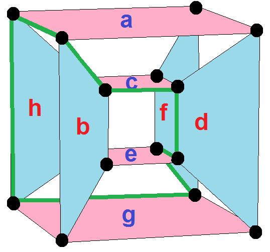 Эскиз в перспективе, представляющий 16 вершин в виде чёрных точек и 8 4-рёбер как квадраты внутри каждого ребра. Зелёный путь представляет восьмиугольный периметр левого изображения. |