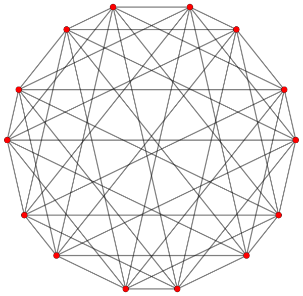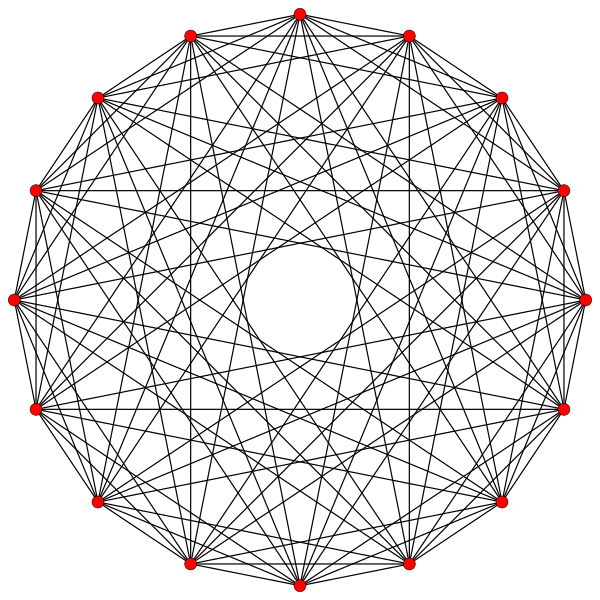 Выше проиллюстрированы три вещественные проекции правильного комплексного многоугольника 4{4}2 с рёбрами a, b, c, d, e, f, g, h. Многоугольник имеет 16 вершин, которые для удобства обзора индивидуально не помечены. Каждое ребро имеет четыре вершины, а каждая вершина лежит на двух рёбрах, поскольку каждое ребро пересекает четыре других ребра. На первой диаграмме каждое ребро представлено квадратом. Стороны квадрата не являются частями многоугольника, но нарисованы исключительно для облегчения визуальных связей четырёх вершин. Рёбра располагаются симметрично. (Заметьте, что диаграмма выглядит подобно B4 плоской проекции Коксетера тессеракта, но структурно она другая).
