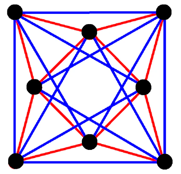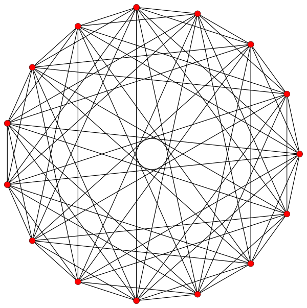 Этот комплексный многоугольник имеет 8 рёбер (комплексные прямые) с метками a..h и 16 вершин. Четыре вершины лежат на каждом ребре и в каждой вершине пересекаются два ребра. На левом рисунке квадраты не являются элементами многогранника, но нарисованы исключительно помочь распознать вершины, лежащие на той же самой комплексной прямой. Восьмиугольный периметр левого изображения не является элементом многогранника, но он является многоугольником Петри[3]. На центральном рисунке каждое ребро представлено как вещественная прямая и четыре вершины на каждой прямой можно легко видеть. |