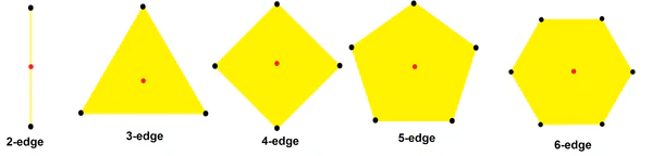 Хотя 1-многогранники могут иметь неограниченную величину p, конечные правильные комплексные многоугольники, за исключением многоугольников двойных призм , ограничены 5-рёбрами (пятиугольные рёбра), а бесконечные правильные апейрогоны включают также 6-рёбра (шестиугольные рёбра).