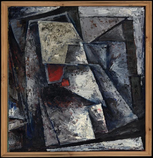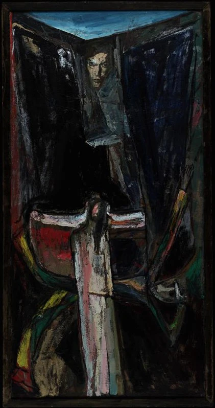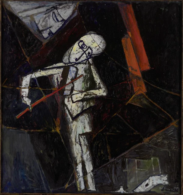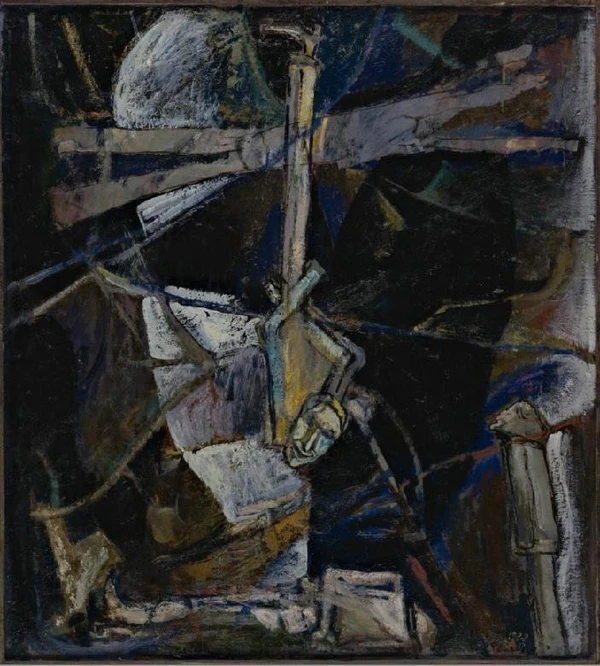 Композиция выполнена в чёрных, синих и коричневых тонах с обильным использованием белил. В центральной части выделяются контрастные участки белого и красного цветов. На фоне просвечивают фрагменты тёплого коричневого тона и иные краски, не входящие в основную гамму, что может свидетельствовать о том, что живописный слой наложен поверх уже существующего изображения.