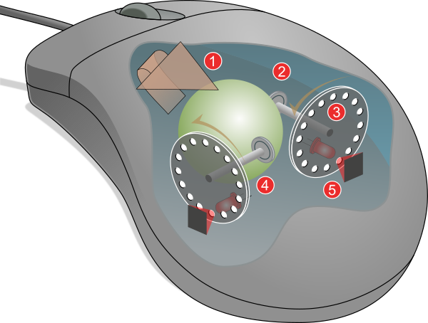 Изначальная конструкция датчика перемещения мыши, изобретённой Дугласом Энгельбартом в Стенфордском исследовательском институте в 1963 году, состояла из двух перпендикулярных колёс, выступающих из корпуса устройства. При перемещении мыши колёса крутились каждое в своём измерении.