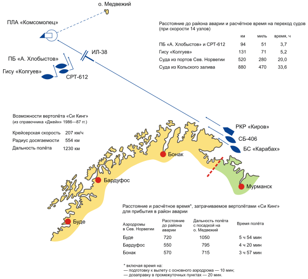 - 11:54 Экипаж лётчика майора Геннадия Петроградского подняли по тревоге, которая была объявлена всем спасательным силам авиации и флота. На КП поставили задачу: в районе острова Медвежий возник пожар на советской атомной подводной лодке. Корабль всплыл, экипаж ведёт борьбу за живучесть. Необходимо выйти в район аварийного корабля, установить с ним связь и непрерывно докладывать обстановку и просьбы командира подводной лодки в штаб флота. В распоряжении спасателей-авиаторов были вертолёты, способные садиться на воду, гидросамолёты. Но решено было послать многомоторный самолёт, способный доставить груз на большое расстояние от берега. Причина — вертолёту не хватит запаса топлива, ведь ЧП произошло за 980 километров от советской границы. У гидросамолёта скорость почти в 2 раза меньше, чем у Ил-38. Кроме того, по докладу командира, ситуация на борту лодки особой тревоги не вызывала.