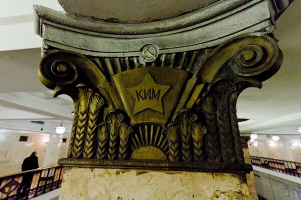 Путевые стены облицованы светлой керамической плиткой. Пол выложен серым и красным гранитом, а пол пешеходных галерей-балконов над путями — керамической плиткой (изначально покрытие было асфальтовым). Квадратные в сечении колонны облицованы золотисто-жёлтым мрамором «чоргунь». Капители колонн украшены бронзовой эмблемой Коммунистического интернационала молодёжи (КИМ), подчёркивающей вклад комсомольцев 1930-х годов в строительство метрополитена[3].