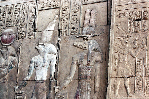 В эпоху Птолемеев в Ком-Омбо были возведены два храма из камня, добытого в карьерах Хаджар-селселех. На песчаном холме возвышался большой Пантеон, согласно сохранившимся записям, посвящённый Аполлону и прочим богам нома. К северо-западу располагался меньший храм в честь Исиды[7]. Они и сегодня поражают своим великолепием и сохранившимися на стенах красочными росписями.