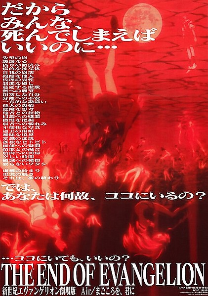 «Конец Евангелиона» (яп. 新世紀エヴァンゲリオン劇場版 Air/まごころを、君に Синсэйки Эвангэрион Гэкидзё:-бан: Эа/Магокоро о, кими ни, «Евангелион [нового поколения]: Фильм — Воздух / Искренне Ваш…»; англ. The End of Evangelion) — полнометражный аниме-фильм 1997 года режиссёра Хидэаки Анно, снятый на студии Production I.G[4]. Вышедший в 1995 году сериал «Евангелион» стал крайне популярен, и потому Gainax приняла решение сделать фильм, который должен был стать ещё одним окончанием истории[5]. Подготовка сопровождалась некоторой самоиронией студии — в промежутке между анонсом и появлением вышел альбом Neon Genesis Evangelion Addition, содержащий, в частности, трек «Shuukyoku no Tsudzuki». Там персонажи оригинального сериала обсуждали, как им сделать наиболее популярное и, соответственно, прибыльное продолжение. Сюжет завершает аниме «Death», а также заменяет 25 и 26 серии оригинального «Евангелиона». Фильм состоит из двух частей: Air («Воздух») / «Любовь разрушительна» и My Purest Heart for You («Искренне Ваш…») / «Вы нужны мне» (まごころを,君に, Magokoro о, Kimi Ni). 25 серия содержит вторую часть фильма Neon Genesis Evangelion: Death & Rebirth. По итогам фестиваля Animation Kobe 23—24 ноября 1997 года The End of Evangelion получил приз зрительских симпатий[6]. В 1998 году фильм занял первое место в гран-при журнала Animage[7].