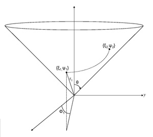 Если путь между двумя точками ограничен поверхностью конуса, задаваемого , то геодезическое расстояние между двумя точками и выражается как