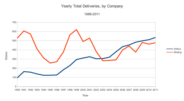 За последние 12 лет (2005—2016) Airbus получил 11830 заказов и поставил 6456 самолётов, в то время как Boeing получил 11024 заказа и поставил 6406 самолётов. Конкуренция между компаниями очень напряжённая. Оба конкурента постоянно обвиняют друг друга в получении несправедливых преимуществ и субсидий от своих правительств.