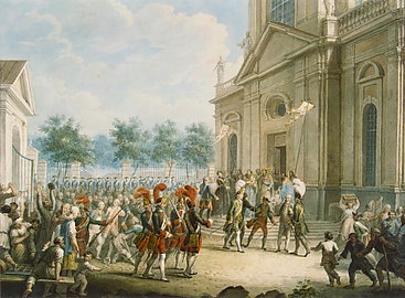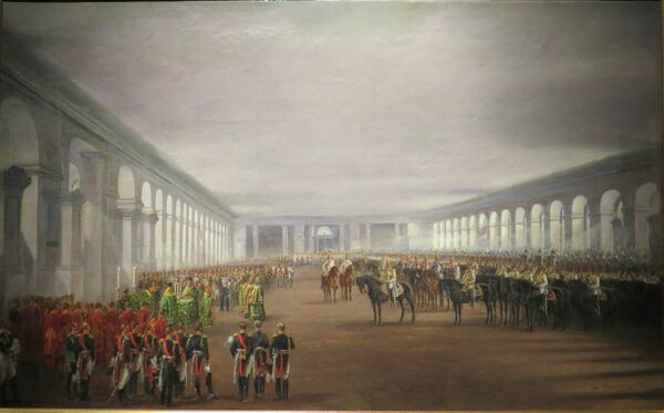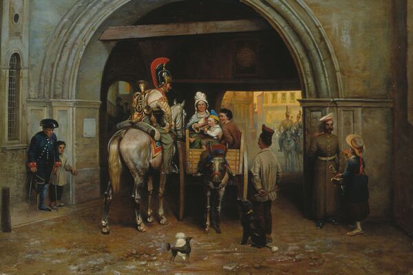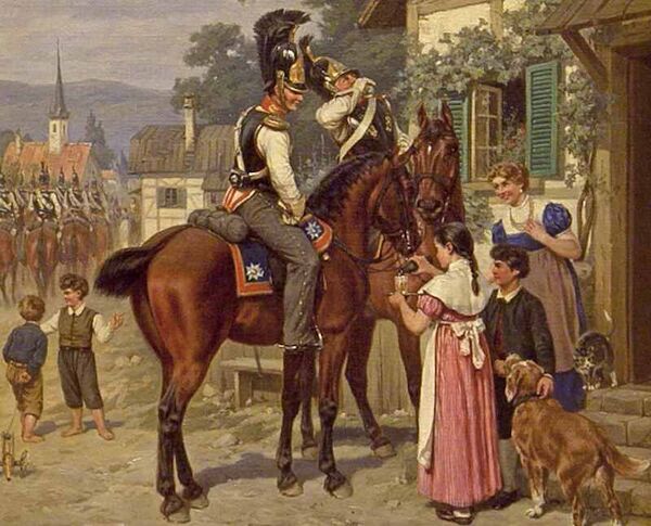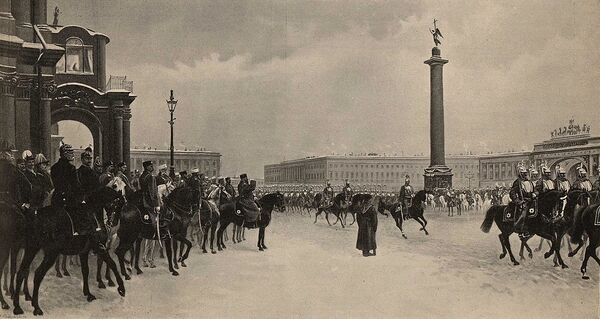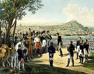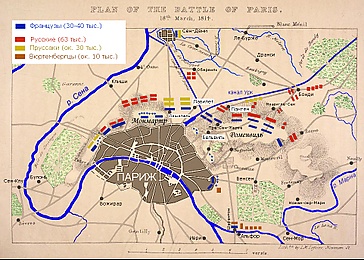 Впервые со времён Столетней войны, иностранная армия вошла в столицу Франции. Колонны войск двигались с барабанным боем, музыкой и распущенными знамёнами, на этот спектакль прибыло огромное количество парижской публики. Предваряемый эскортом лёгкой кавалерии Александр I лично возглавлял этот парад союзных войск, а конногвардейцы вместе с другими кирасирами завершали пятичасовое триумфальное шествие русских, прусских и вюртембергских войск к Елисейским Полям. Достигнув цели, царь со свитой остановился на главной аллее и принял парад войск союзников, прошедших перед ними церемониальным маршем[31].