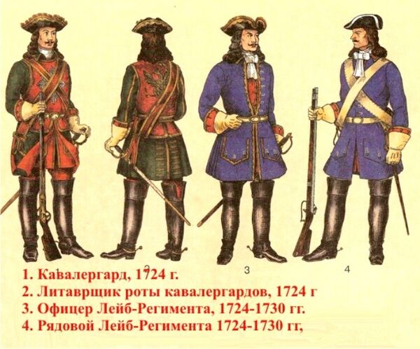 В 1730-е годы повседневная форма конногвардейцев была аналогична драгунской, отличаясь только красным цветом камзола и штанов. Конногвардейцы носили на голове парики, покрытые пудрою (белым порошком), галун на унтер-офицерском кафтане был серебряным (позолоченным). Парадная форма состояла из колета, подколета и штанов из оленьей кожи, железной полукирасы с медными элементами, палаша на поясной портупее, карабина без штыка с перевязью и двух пистолетов. При этом мундире полагалось носить белый галстук, перчатки с обшлагами и шляпу с золотым галуном. Снаряжение, конский убор и сбруя были аналогичны драгунским, чепраки (вальтрапы) были из красного сукна и обшиты широким золотым галуном.