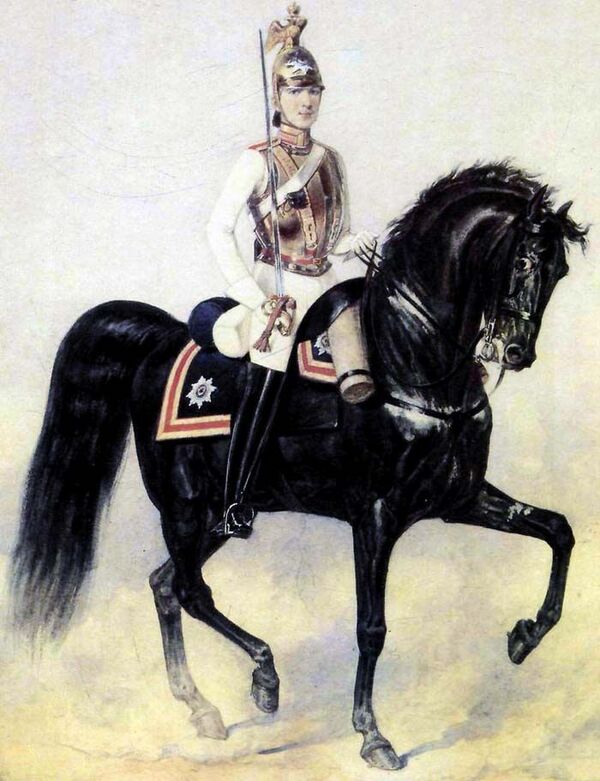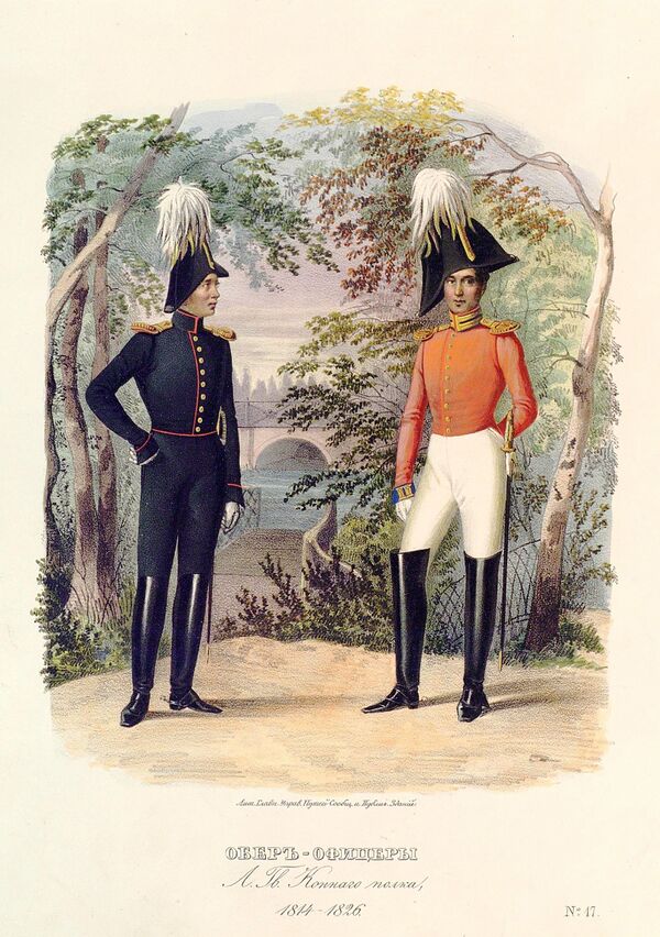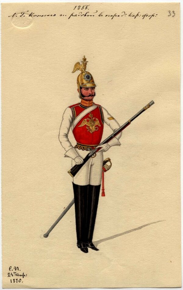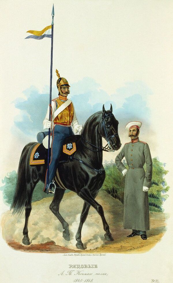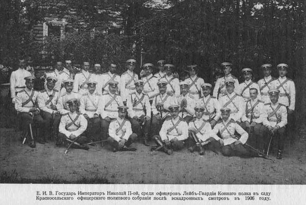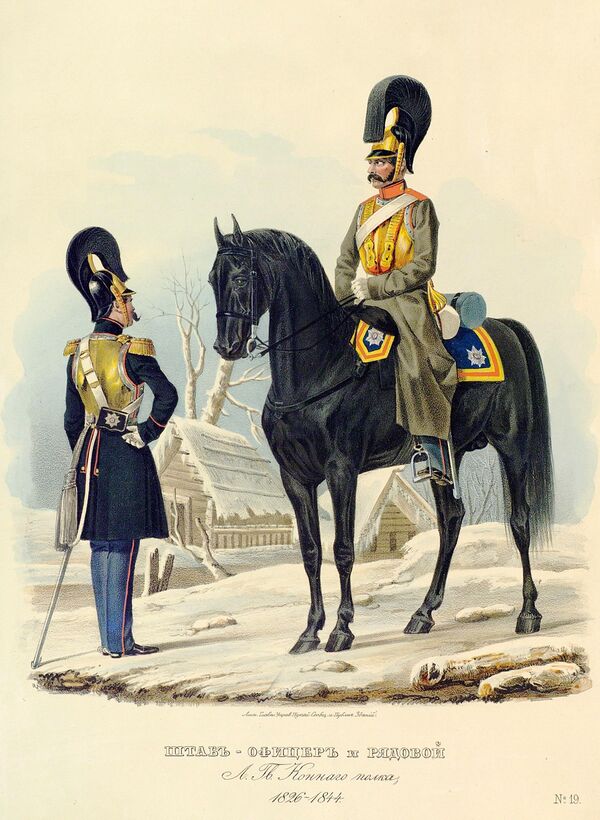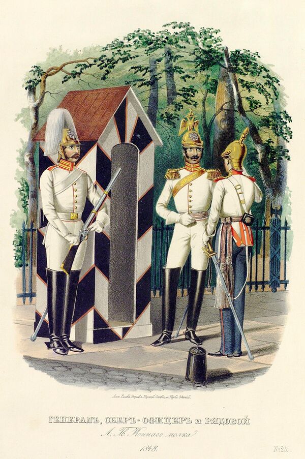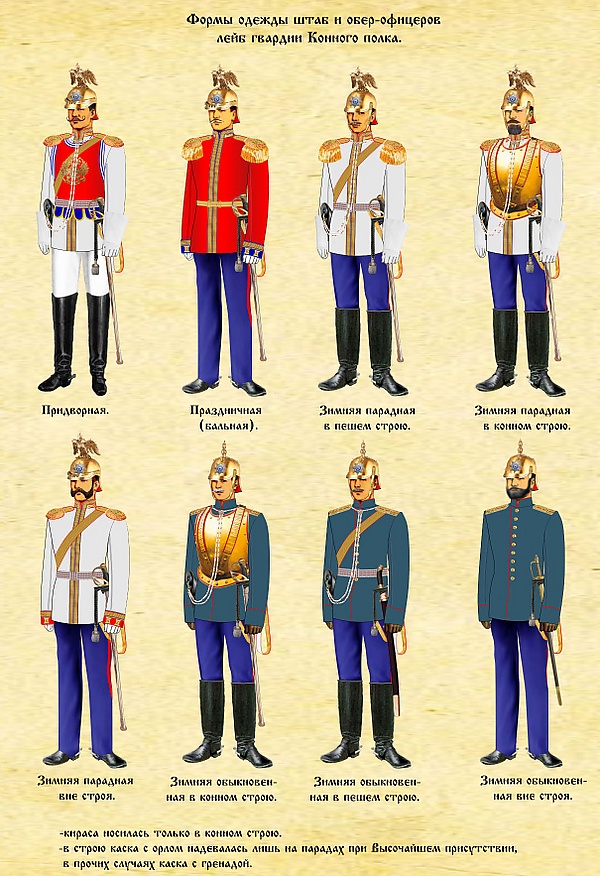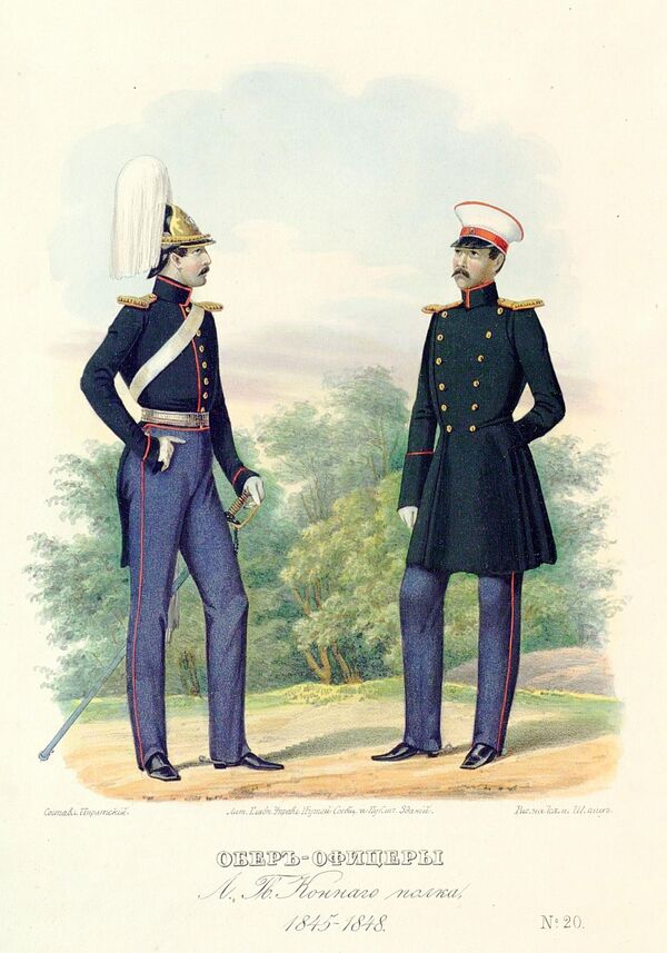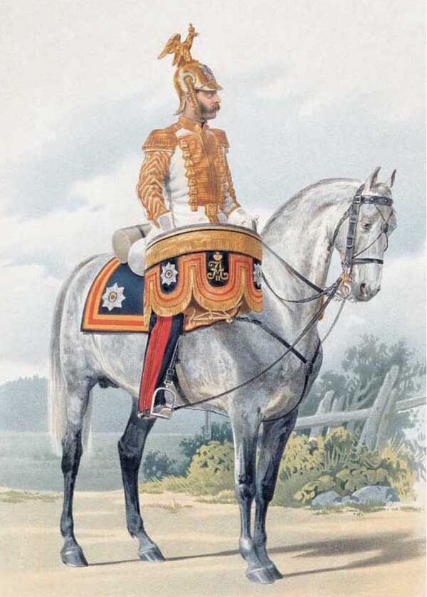 В николаевскую эпоху XIX века Конная Гвардия играла заметную роль в столичной жизни. В полку служили и представители русских княжеских, и старинных дворянских родов (князья Голицыны, кн. Урусовы, Нарышкины, Анненковы, Опочинины, Свечины, Бибиковы, Головины, Дурново, Бутурлины, Чичерины, кн. Васильчиковы), и титулованных фамилий, выдвинувшихся в XVIII веке (графы Строгановы, гр. Орловы, гр. Шуваловы, гр. Гудовичи), и новой николаевской чиновной элиты — бароны Штакельберги, гр. Канкрины или Адлерберги. Мундир конногвардейца служил своеобразной вывеской принадлежности к великосветскому обществу[22].