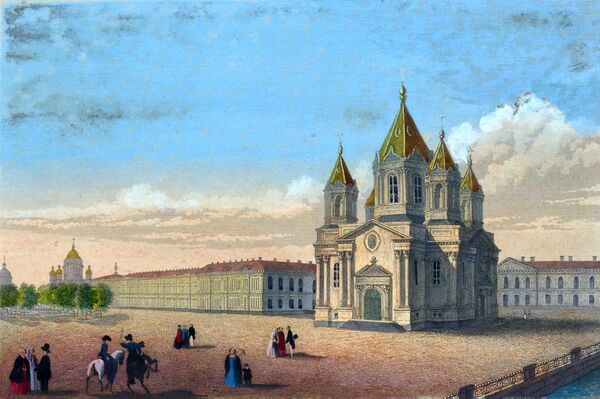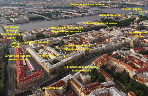 В 1844—1849 годах неподалёку от казарм, на Морском лугу, был возведён полковой храм — Благовещенская церковь. Здание в русско-византийском стиле, построенное по проекту архитектора Константина Тона, было снесено вскоре после закрытия церкви в 1929 году под предлогом «стеснения трамвайного движения». Фундаменты, пещерный храм и некрополь были уничтожены в середине 1990-х годов при строительстве подземного торгового комплекса (в настоящее время — подземный переход под площадью Труда).
