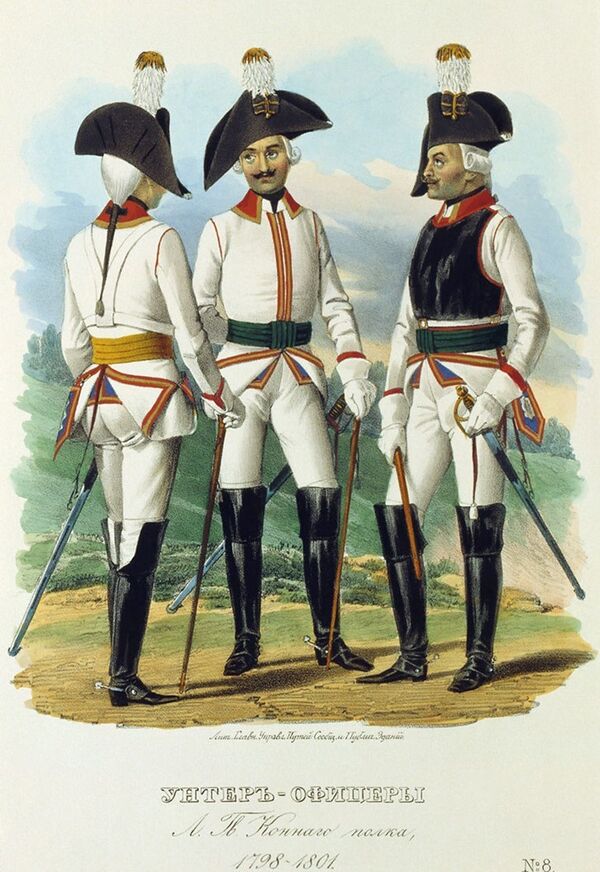 После смерти Екатерины II и с воцарением 6 (17) ноября 1796 года императора Павла I в Русской армии и, в частности, в её военной форме, вновь возобладали прусские мотивы, большим поклонником которых являлся Павел Петрович. В первый же день своего восшествия на престол, император ввёл новую форму в гвардии, в частности, Конный полк получил, по воспоминаниям генерал-майора Саблукова Николая Александровича, «…новый походный мундир коричневого цвета, а вицмундир кирпичного цвета и квакерского покроя». Полку были выданы чёрные железные кирасы. В дни торжественных праздников во дворце конногвардейцы вместо них надевали парадные, из кованного серебра с золочёными звёздочками, латы, на которых спереди и сзади был размещён российский герб, и серебряный рыцарский шлем с белыми и красными перьями. Что касается дисциплины, то «…офицеры гвардии за проступки теперь легко могли быть подвергнуты аресту, и никакие личные или сословные соображения не могли спасти виновного от наказания»[15].