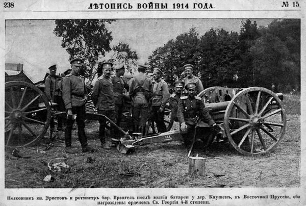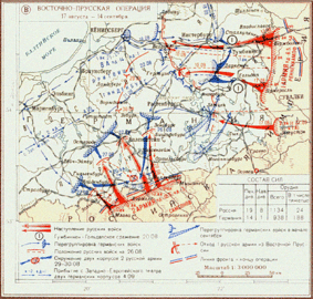 На следующий день, 20 августа, при Гумбиннене разыгралось знаменитое сражение, в котором участвовали 64 тысячи чинов 1-й (Неманской) армии русских против 75 тысяч немцев 8-й армии фон Притвица (перевес врага по пехоте был полуторным, по артиллерии — почти двойным). Однако, германская армия была разбита и начала стратегическое отступление. Для исправления положения начальник германского Полевого Генерального штаба генерал-полковник Гельмут Иоганн Людвиг фон Мольтке (младший) приказал снять с Западного фронта пять дивизий для немедленной отправки на восток и вынужден был отказаться от катастрофического для французов охвата Парижа, Франция была спасена[38].