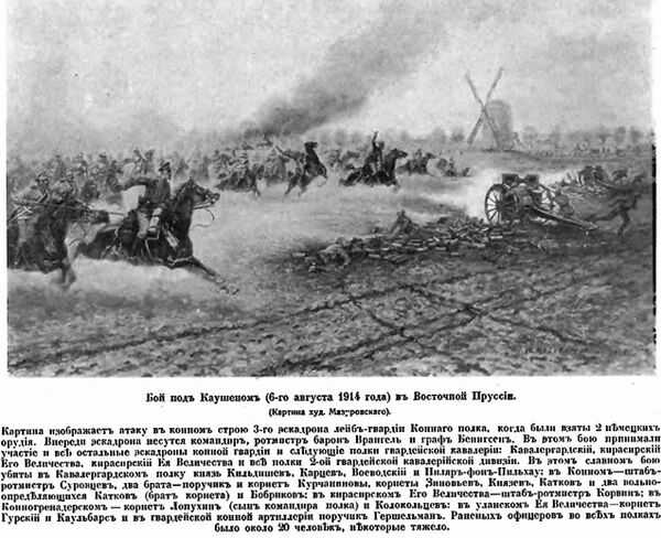 3 (16) августа 1914 года после 11-дневной осады германские войска заняли франкоязычный город и крепость Льеж. Выполняя свои обязательства перед Францией по союзу Антанта, 4 (17) августа 1914 года Россия перешла в наступление на Кёнигсбергском направлении, — началась Восточно-Прусская операция (1914). 1-я (Неманская) армия генерала от кавалерии Ренненкампфа Павла Карловича перешла германскую границу в направлении Гумби́ннена. На её правом фланге наступал Лейб-гвардии Конный полк в составе 1-й гвардейской кавалерийской дивизии Сводного кавалерийского корпуса Хана Нахичеванского Гусейна Келбали, командовавшего полком в 1906—1911 годах.