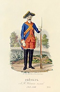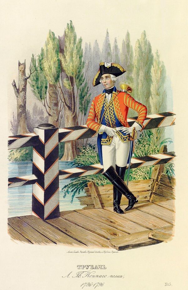 Взяв власть в 1762 году, Екатерина II распорядилась остановить переделку военной формы, начатую Петром III, и позднее внесла свои изменения. Литаврщику и трубачам были даны кафтаны из красного сукна, а казакины из голубого. Полк получил золотые с голубым шёлком эполеты. Офицерам и нижним чинам разрешено было в холодную погоду поверх одежды носить шинели из синего сукна с красными обшлагами, подложенные овчиной, с полами, обшитыми волчьим мехом. Шпаги были заменены тесаками.