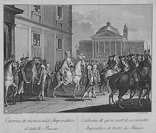 28 июня (9 июля) 1762 года в результате дворцового переворота был свергнут император Пётр III, и на престол взошла его супруга Екатерина II. В перевороте, наряду с другими гвардейцами, участвовали конногвардейцы: секунд-ротмистры Хитрово Фёдор Алексеевич, Ржевский Александр Ильич, Несвицкий Иван Васильевич и подполковник Волконский Михаил Никитич. В день восшествия на престол все находившиеся в столице полки гвардии и армии были собраны перед Зимним дворцом. Государыня, принявшая на себя звание шефа гвардейских полков, лично и верхом принимала присягу от войск. На другой день Императрица, сопровождаемая конногвардейским конвоем, возвратилась в Петергоф и приказала перевести туда весь полк.
