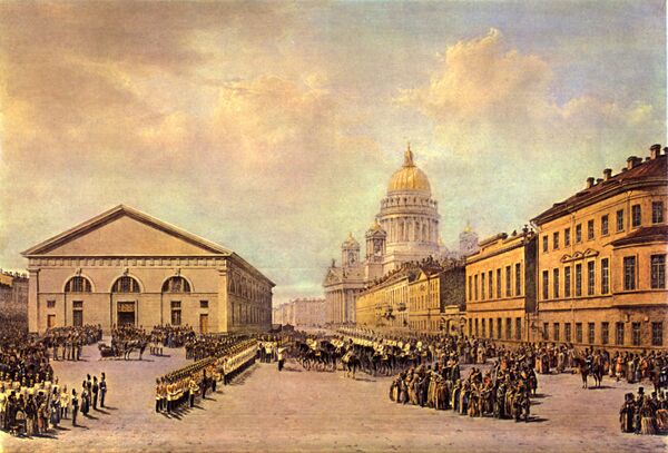 Конногвардейский манеж был возведён в 1804—1807 годах по проекту архитектора Джакомо Кваренги. Здание в классическом стиле, вытянутое между Конногвардейским бульваром (№ 2) и Адмиралтейской улицей (современный адрес — улица Якубовича, 1) своим фасадом обращено к Сенатской площади и Александровскому саду.