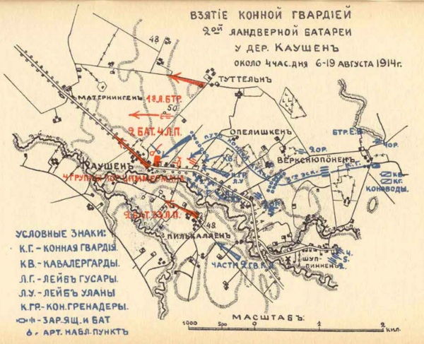 6 (19) августа 1914 года полк участвовал в сражении при Каушене, где гвардейцы в пешем строю атаковали немецкие позиции. Полк понёс тяжелейшие потери. Исход боя решила конная атака на артиллерийскую батарею 3-го эскадрона ротмистра Врангеля Петра Николаевича, под которым последним орудийным выстрелом была убита лошадь. К пяти часам пополудни противник был сильно потрёпан, отброшен за реку Инстер, а затем отступил на 10—15 вёрст западнее Каушена. В память об этом славном бое захваченные конногвардейцами 2 германских 77-мм орудия и 4 зарядных ящика Высочайшим повелением были пожалованы в собственность («в дар») лейб-гвардии Конному полку[37]. За свой подвиг барон Врангель был награждён орденом Святого Георгия IV степени. Император Николай II в своём дневнике отметил, что ротмистр Врангель был первым офицером, ставшим Георгиевским кавалером в войну 1914 года. В Каушенском бою полк потерял 14 офицеров и 38 нижних чинов[30].