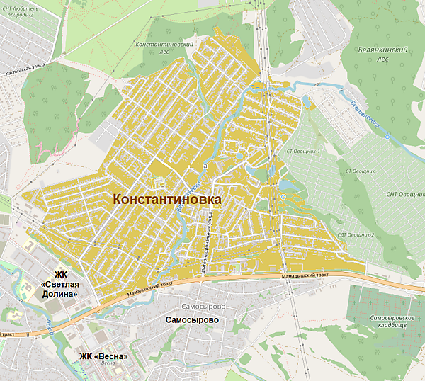 Всего в границах посёлка Константиновка и по его периметру имеется 56 улиц, из которых одна именуется трактом, восемь — переулками. Две улицы посёлка имеют одинаковые названия — Лесная[29]; одна расположена на его северо-восточной окраине, другая — на северо-западной.