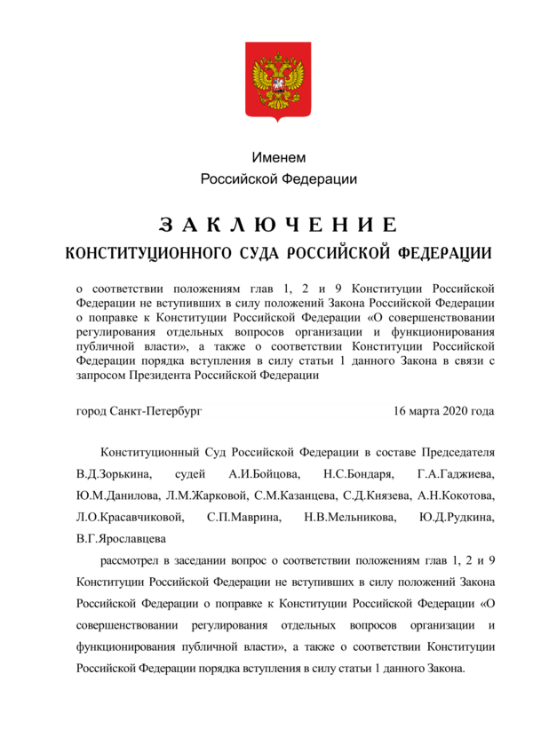 - 2020 год — Заключение о соответствии главам 1, 2 и 9 Конституции вносимых президентом поправок к главам 3—8 Конституции[45].