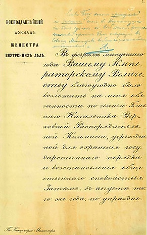 Согласно дневнику генеральши Богданович, конституционный проект был разработан в петербургском салоне Елены Нелидовой[2]. «Всеподданнейший доклад» с изложением этого плана был подан Лорис-Меликовым императору 28 января 1881 года. Он был единогласно одобрен 16 февраля Особым совещанием (в присутствии будущего Александра III). 1 марта император сообщил Лорис-Меликову, что через четыре дня проект будет вынесен на обсуждение Совета министров. В тот же день, через 2 часа, император погиб в результате террористического акта.