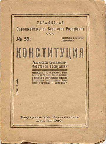 10 марта 1919 года 3-й Всеукраинский съезд Советов принял первую конституцию Украинской ССР. Была принята в окончательной редакции Всеукраинским Центральным Исполнительным Комитетом на заседании 14 марта 1919 года)[3].