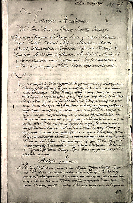 Статья I Конституции утверждала римско-католическую веру в качестве «доминирующей религии», гарантируя при этом терпимость и свободу для всех конфессий[27][56]. Данное положение стало менее прогрессивным, чем Варшавская конфедерация XVI века, и откровенным образом включало Польшу в сферу влияния католицизма[71]. Статья II подтверждала многие старые шляхетские привилегии; там же отмечалось, что все дворяне обладают равными правами, должны располагать личной безопасностью и правом на собственность[72]. В статье III заявлялось, что Акт о вольных королевских городах — неотъемлемая часть Конституции. Личная безопасность — neminem captivabimus, польский аналог habeas corpus — распространялась на всех горожан, в том числе и на евреев. Кроме того, мещане получали право приобретать землю в собственность и занимать военные и гражданские должности. За ними были зарезервированы места в сейме и исполнительных комиссиях по делам казны, полиции и судебной власти[4][61]. Наконец, была упрощена процедура получения дворянского титула городскими жителями[73].