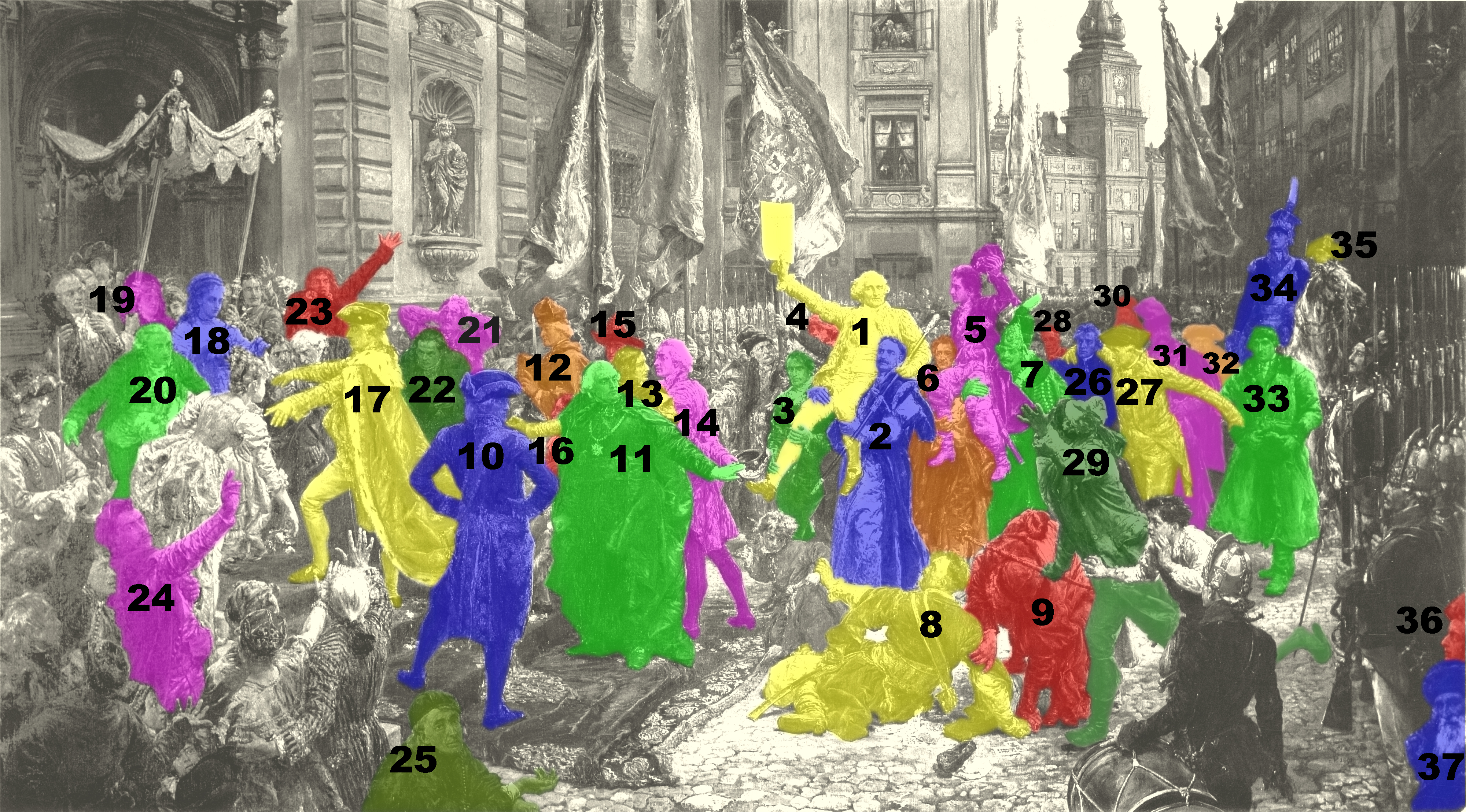 По улице по направлению к костелу движутся, окруженные приветствующей их толпой, творцы и сторонники Конституции. Процессию возглавляет король Станислав Август Понятовский (17). Чуть поодаль от короля идет автор реформы образования Гуго Коллонтай (11). За его спиной стоят Игнатий Потоцкий (13) и Адам Чарторыйский (14).