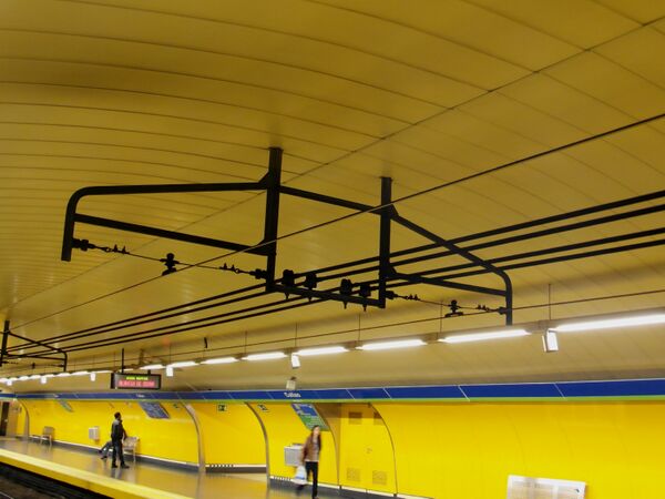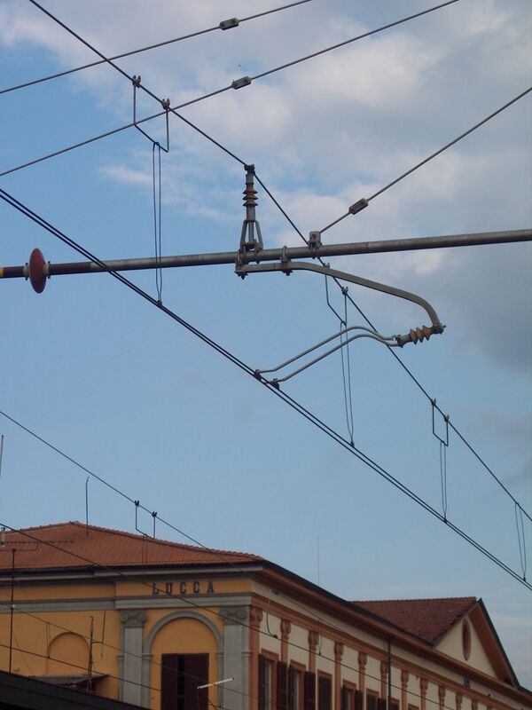 Контактный провод подвешивается в горизонтальной плоскости зигзагообразно с отклонением от продольной оси пути ± 300 мм (для колеи 1520 мм), что повышает его ветровую устойчивость и снижает износ токоприёмников (вследствие более равномерного контакта по всей их длине)[2]. Контактные провода изготавливаются из твердотянутой электролитической меди либо из более дорогих и износостойких медно-кадмиевых и медно-магниевых сплавов. Реже могут применяться биметаллические контактные провода, такие как медные со стальным сердечником, алюминиево-стальные со стальной контактной поверхностью. Струны подвески обычно изготовляют из сталемедных проводов, несущие тросы — из медных, сталемедных, сталеалюминиевых многожильных проводов.