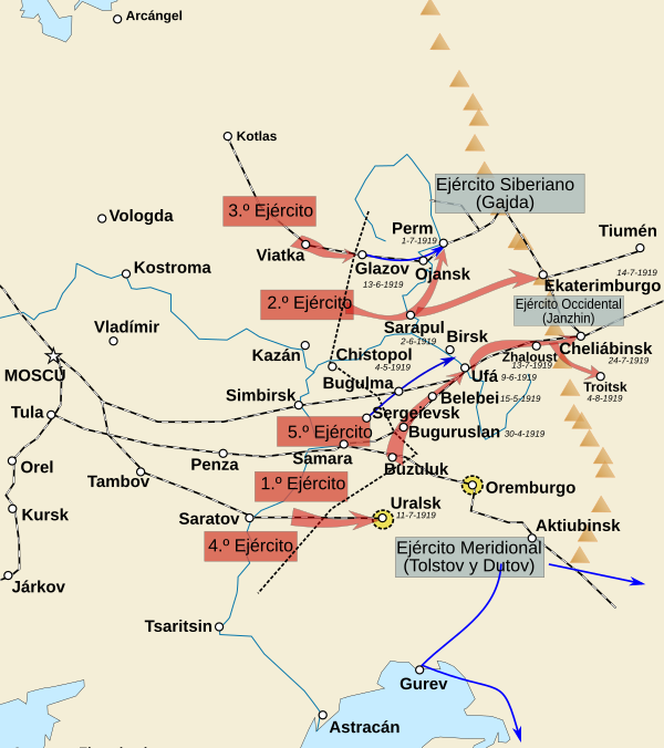 На Восточном фронте и красные, и белые готовились наступать весной 1919 года, но белые ударили первыми. Их операции в марте-апреле 1919 года привели к стратегическому прорыву в центре фронта. Командование большевиков было вынуждено перебросить на восток стратегические резервы: 2-ю стрелковую дивизию и две стрелковые бригады, также в распоряжение командования красного Восточного фронта поступила заканчивавшая формирование в Казани 35-я стрелковая дивизия.