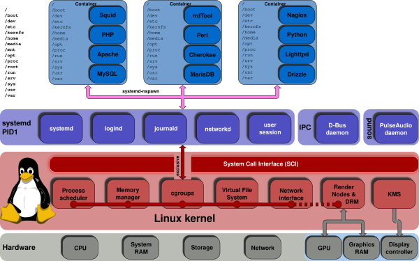 - косвенно через другие программные средства, использующие контрольные группы, например, через системы контейнеризации LXC[9] и Docker, библиотеку libvirt, технологию инициализации systemd, кластерное управляющее программное обеспечение Grid Engine[10].