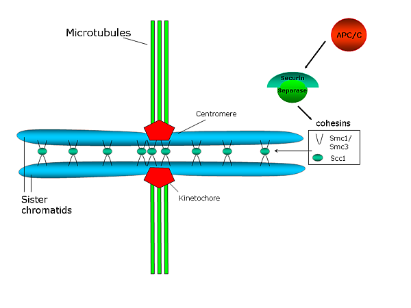 У S. cerevisiae Pds1p (также известный как секурин) регулирует сцепление сестринских хроматид, поскольку он связывает и ингибирует протеазу Esp1p (сепарин или сепараза). Когда начинается анафаза, активирующий анафазу комплекс (APC/C или циклосома) расщепляет секурин. APC/C представляет собой кольцевую убиквитинлигазу Е3, которая рекрутирует убиквитин-конъюгирующий фермент Е2, нагруженный убиквитином. Секурин распознается только в том случае, если Cdc20, субъединица активатора, связана с ядром APC/C. Когда секурин, Cdc20 и E2 все связаны с APC/C, E2 убиквитинирует секурин и избирательно разрушает его. Деградация секурина высвобождает протеазу Esp1p/separase, которая разрушает когезиновые кольца, связывающие две сестринские хроматиды, тем самым способствуя разделению сестринских хроматид[44]. Также было показано, что киназа Polo/Cdc5 фосфорилирует остатки серина рядом с сайтом разрезания для Scc1, и это фосфорилирование должно способствовать активности разрезания[45].