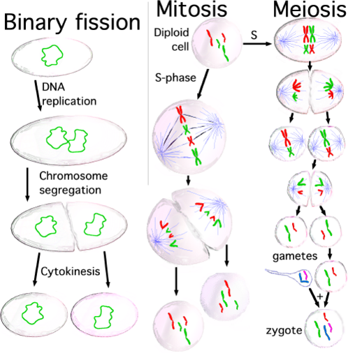 Когда клетки готовы к делению, поскольку их размер достаточно велик или они получают соответствующий стимул[20], они активируют механизм для вступления в клеточный цикл и дублируют большинство органелл во время фазы S (синтеза), включая их центросомы. Поэтому, когда процесс клеточного деления завершится, каждая дочерняя клетка получит полный набор органелл. В то же время во время S-фазы все клетки должны очень точно дублировать свою ДНК — процесс, называемый репликацией ДНК. Как только репликация ДНК завершена, у эукариот молекула ДНК уплотняется и конденсируется, образуя митотические хромосомы, каждая из которых состоит из двух сестринских хроматид, которые удерживаются вместе за счет установления сцепления между ними; каждая хроматида представляет собой законченную молекулу ДНК, прикрепленную через микротрубочки к одной из двух центросом делящейся клетки, расположенных на противоположных полюсах клетки. Структура, образованная центросомами и микротрубочками, называется митотическим веретеном из-за её характерной формы, удерживающей хромосомы между двумя центросомами. Обе сестринские хроматиды остаются вместе до анафазы; в этот момент они отделяются друг от друга и направляются к центросоме, к которой прикреплены. Таким образом, когда две дочерние клетки разделятся в конце процесса деления, каждая из них получит полный набор хроматид. Механизм, отвечающий за правильное распределение сестринских хроматид при клеточном делении, называется сегрегацией хромосом.
