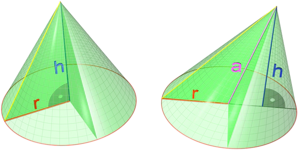 Прямой круговой конус как тело вращения образован прямоугольным треугольником, вращающимся вокруг одного из катетов, где h — высота конуса от центра основания до вершины — является катетом прямоугольного треугольника, вокруг которого происходит вращение. Второй катет прямоугольного треугольника r — радиус в основании конуса. Гипотенузой прямоугольного треугольника является l — образующая конуса.