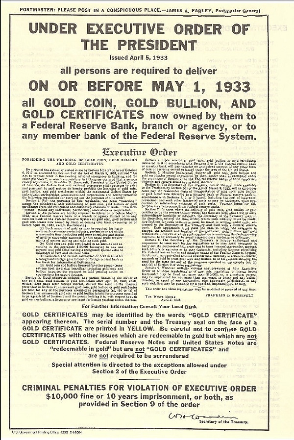 Во время Великой депрессии, 5 апреля 1933 года президентом США Франклином Рузвельтом был подписан Указ № 6102 о фактической конфискации у населения и организаций золота, находившегося в слитках и монетах. Дабы не спровоцировать сильное падение своего рейтинга, на церемонии подписания постановления Рузвельт прямо сказал присутствующим, что автор документа — не он. Даже секретарь Казначейства заявил, что не был ознакомлен с документом, лишь добавив — «…это то, на чем настаивали эксперты».