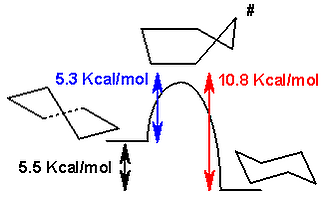 Когда говорят о стабильности, имеют в виду термодинамическое свойство вещества (в данном случае его конформации), которое количественно измеряется с помощью энергии Гиббса[14]. Тогда конформация вещества A более устойчива чем его изомер B, если для реакции A → B. Так, например, имеем две реакции: