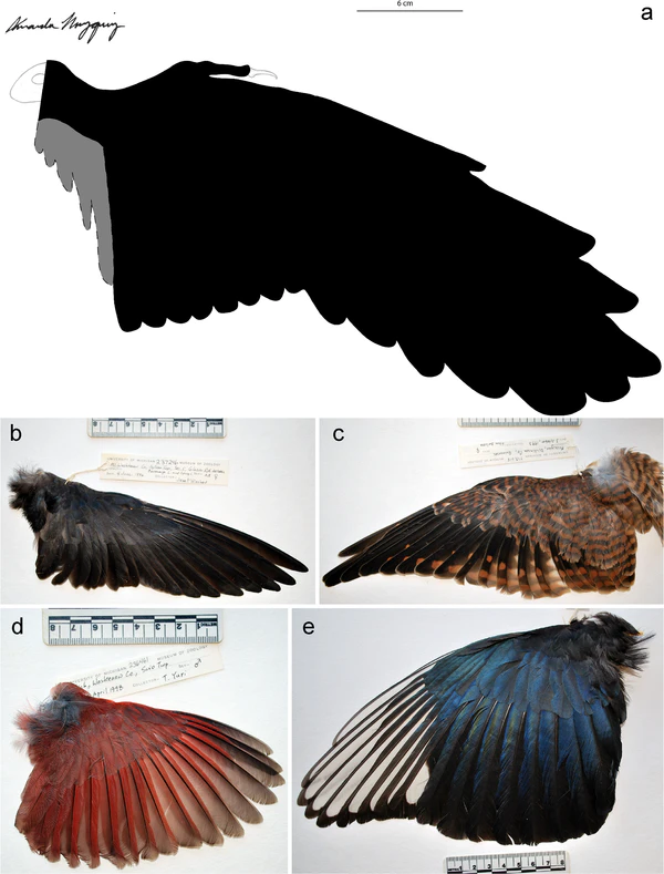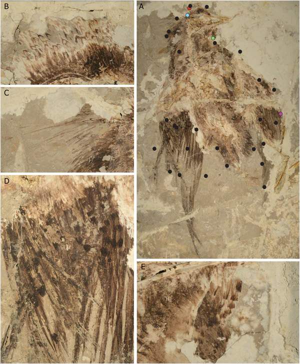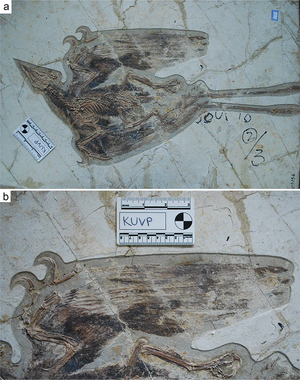Исследование образца CUGB P1401, проведённое в 2018 году, показало наличие больших пятен на крыльях, шее и холке конфуциусорниса[33].